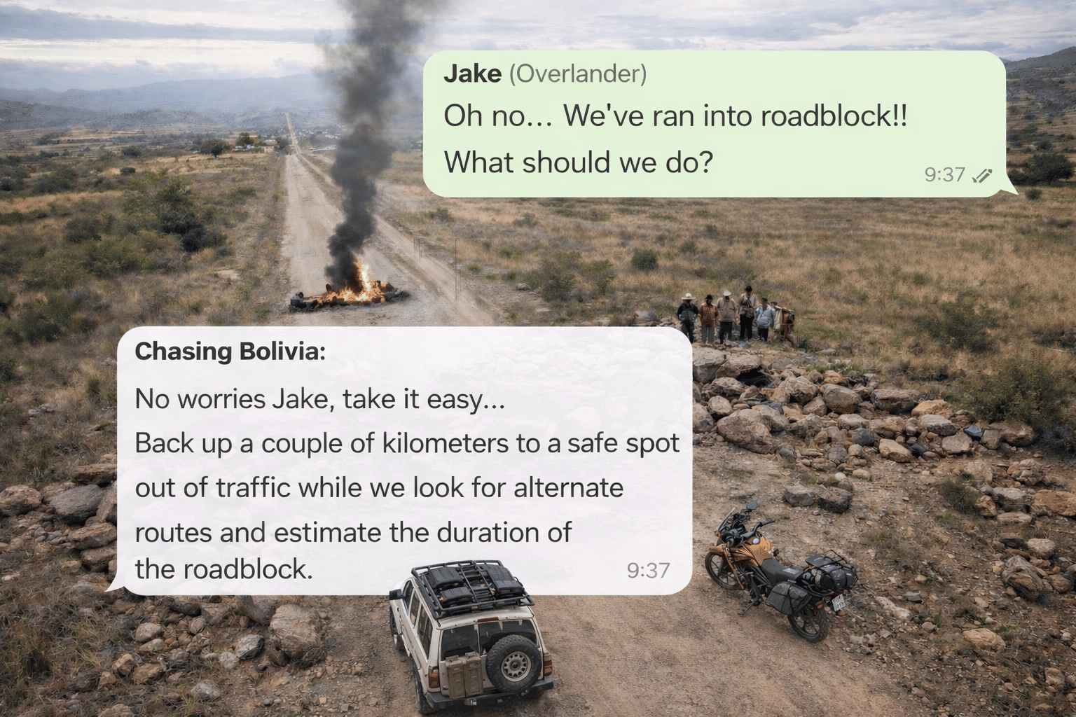Travel consulting & local backup for independent overlanders, road trippers, and adventure riders exploring Bolivia. Real-time guidance, problem-solving, and emergency coordination — so you can travel freely, never alone.